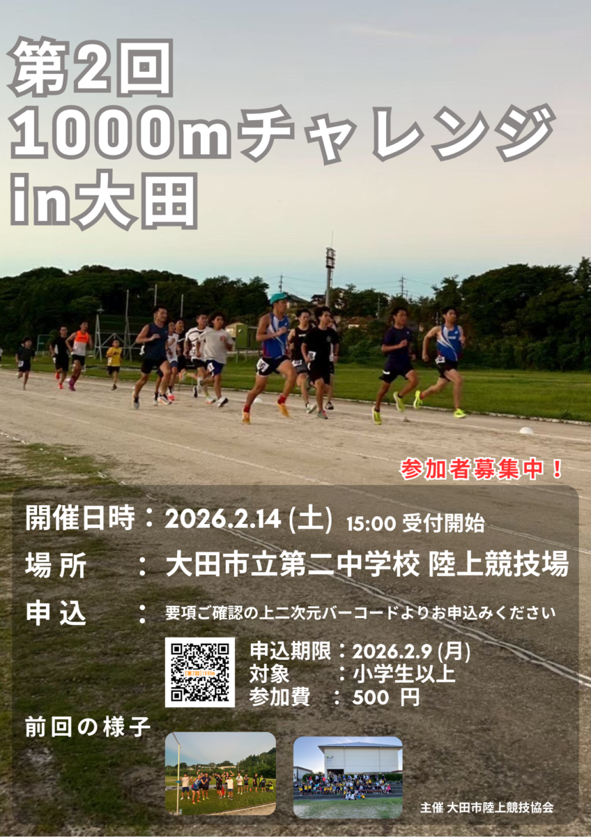 2026年2月14日(土)に大田二中陸上競技場で「第2回 1000mチャレンジ in 大田」(主催 大田市陸上競技協会)が開催されます。前回参加された方はタイム更新を目指して、また参加されていない方も自らの能力チェックとしてエントリーされてはいかがでしょうか。詳細は下のちらし、開催要項をご覧ください。