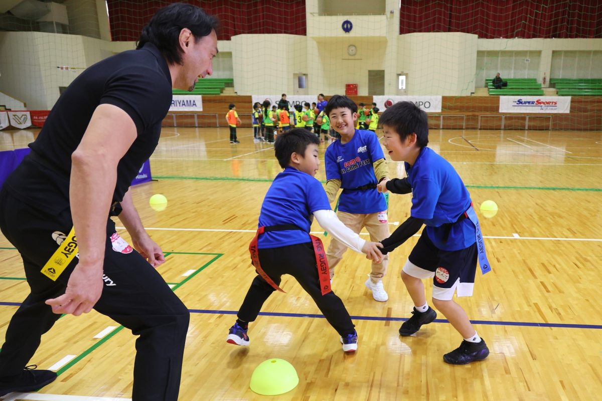 午後からは「キッズチャレンジ」。小学生の参加者が3チームに分かれて45分ずつ「バスケットボール」、「ハンドボール」、「ラグビー」と3つの競技に挑戦しました。
