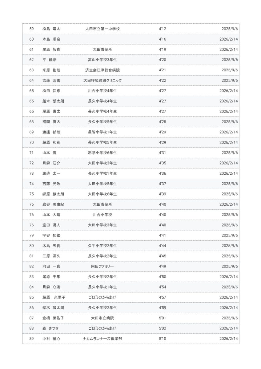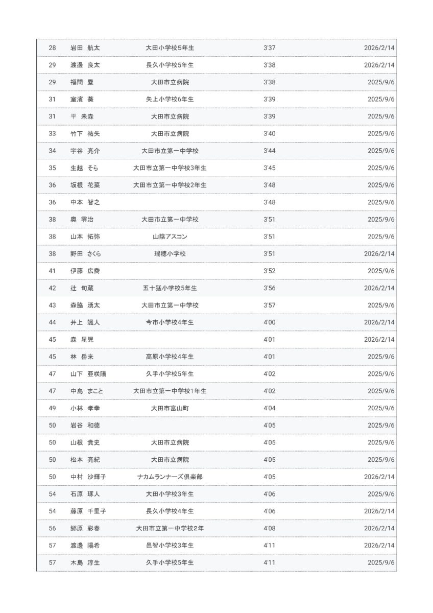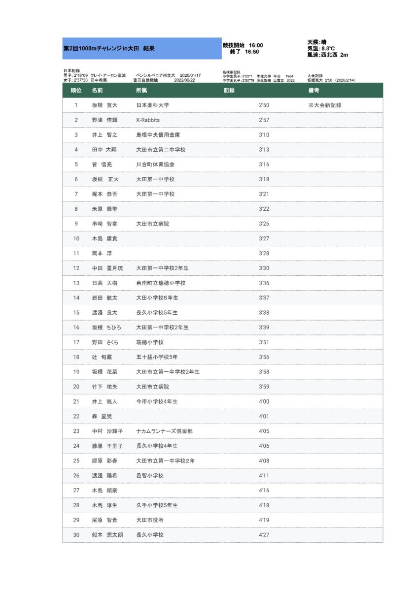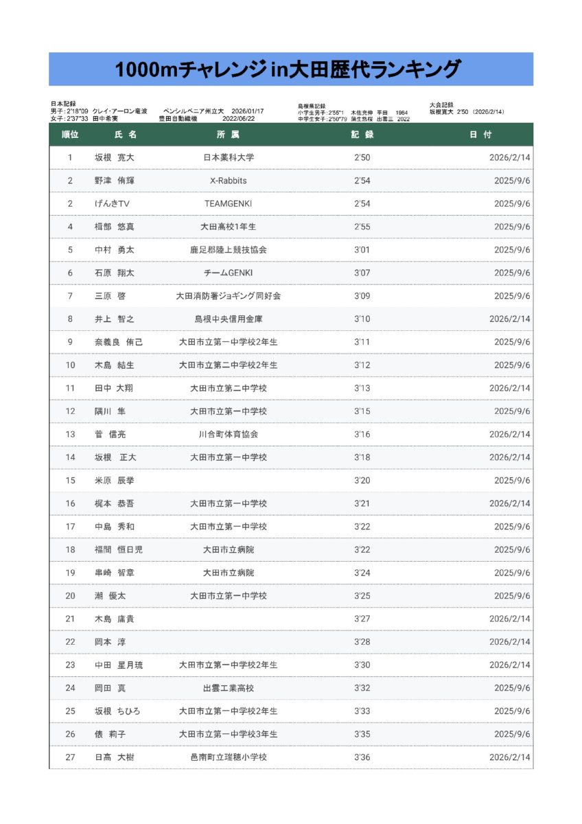 今回で2回目となる「1000mチャレンジin大田」が2月14日、大田市陸上競技協会の主催で開催されました。以下は主催者からの開催報告です。